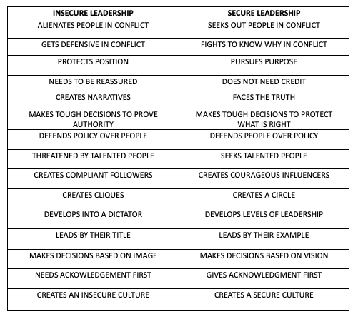 People can obtain a leadership position for lots of reasons…. education, experience, performance, relationships, certifications, etc…. The perks of status, a pay raise, and influence can definitely seem more appealing and these positions can be highly wanted. However one’s leadership potential cannot be measured until they are actually leading. Performance or production is not the same as leading people, and it is important that we have foundational principles. Everything rises and falls on leadership and it will always be about purpose and people. The last thing you need to think is that it is about you and your professional goals….. Insecurity creeps in when you focus on your position more than your purpose, your position more than dealing with people, or your position over knowing your plan. An insecure leader thinks that everything is about them, struggles with relationships, and as a result creates paranoia or insecurity in their staff. People begin to feel dispensable, that they cannot be themselves, and go into self protection mode. An insecure leader can take very driven people and cripple their ability to make a difference. It is like having a fire that just needs more fuel, but instead deciding to sprinkle water on it. Insecure leaders are in fight or flight mode and they alienate and get highly defensive in conflict. Secure leaders focus on their purpose and people by aligning both with a plan. They find their security in their work ethic and example toward something greater than themselves. They in turn create a culture where people have the opportunity to be the best version of themselves and advance. If we had bad examples or have little experience leading people, then we can have the wrong mindset or low confidence to start our position. We are only as good as our examples or experiences and if we lack them, then we need to be educated. I am so thankful that I had a great example to learn from in Ronnie McClurg. He made me feel like the most important person on earth and let me grow in my position. In return, I was on fire to do a great job for him and help him be successful. He was a man full of wisdom and true love for people, and to this day, who I compare myself and others too. When you have seen and experienced the best, then you can pinpoint the opposite. Here are a few examples of the differences of an insecure and secure leader: